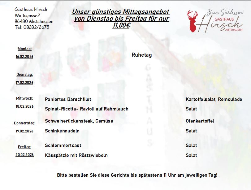 Genießen Sie täglich wechselnde, leckere Gerichte frisch zubereitet aus unserer Küche – ideal für eine entspannte Mittagspause oder zum Mitnehmen. Profitieren Sie von günstigen Preisen und herzlichem Service.